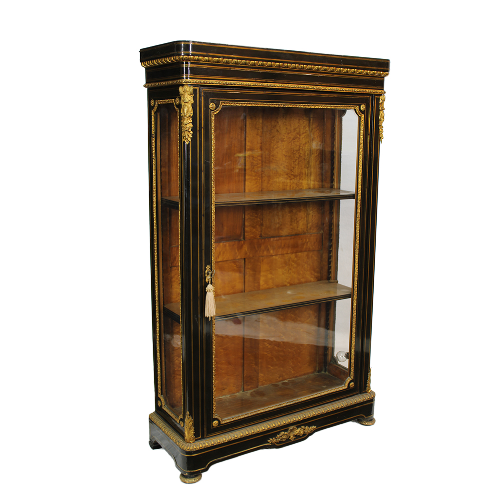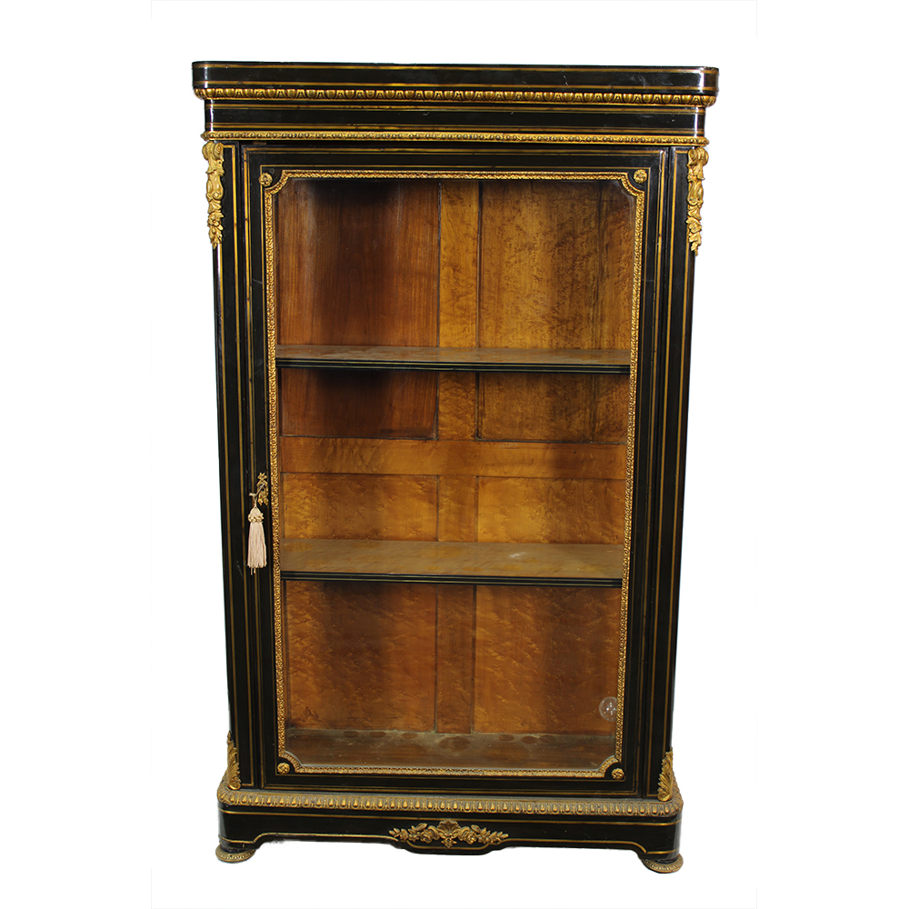 ELEGANTE PICCOLA VETRINA NAPOLEONE III AD UN ANTA in legno ebanizzato con perfili in ottone arricchita da profili e fregi in bronzo finemente cesellati e dorati al mercurio Francia XIX secolo h cm 140 x 88 x 32