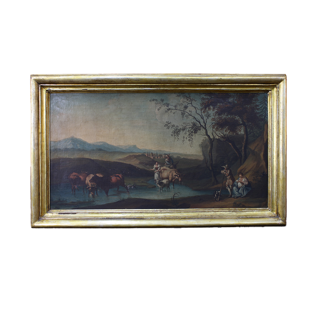 OLIO SU TELA raffigurante paesaggio con pastori ed armenti dentro cornice dorata ad argento e mecca e laccata scuola veneta XVIII secolo h cm 55 x 102 - cornice h cm 72 x 120