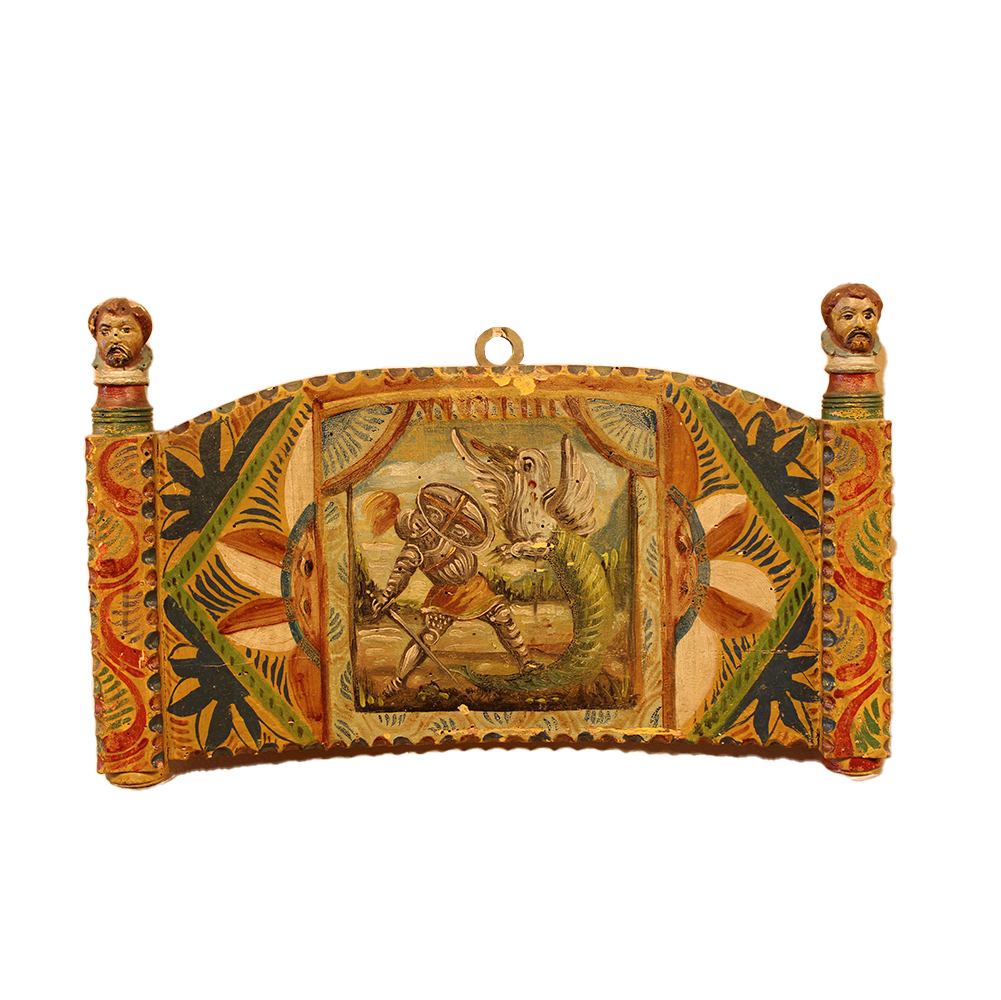 ELEMENTO DI SEDIE in legno scolpito e dipinto in policromia dentro riserva raffigurante paladino che lotta con il drago maestranze siciliane XIX/XX secolo h cm 29,5 x 47,5