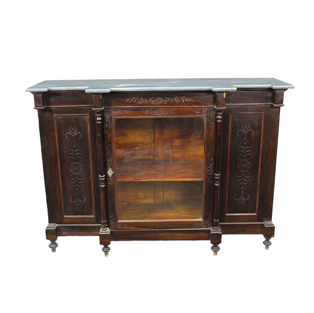 ETAGERE in legno di palissandro arricchito da incisioni a motivi floreali, anta a vetro, marmo grigio di Billiemi, mancano 2 colonne Sicilia XIX secolo h cm 107 x 152 x 52