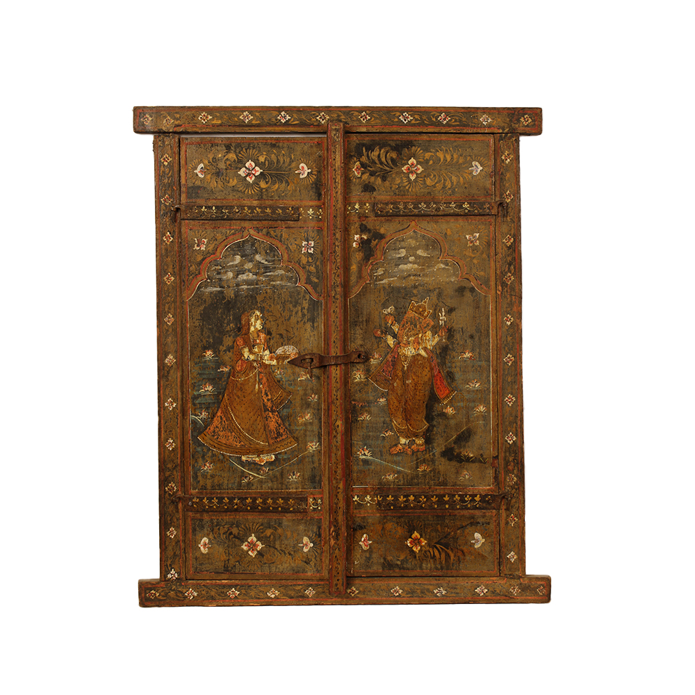 PICCOLA FINESTRA A DUE ANTE in legno dipinta raffigurante personaggi, maestranze asiatiche XIX secolo h cm 63,5 x 57