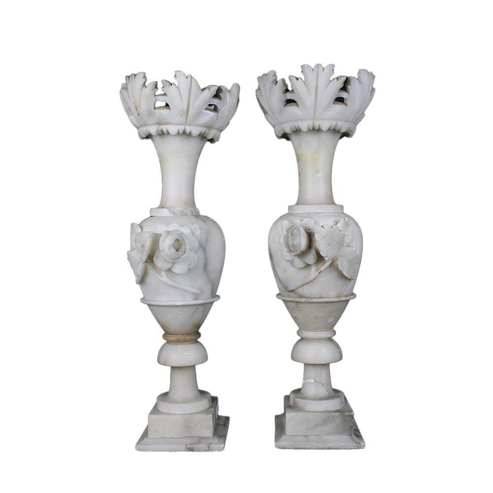 COPPIA DI VASI in alabastro scolpito e tornito, rotture e mancanze Francia seconda meta XIX secolo h cm 45 x 15