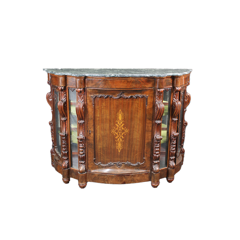 ETAGERE CARLO X in mogano riccamente scolpito con tarsie in bosso piano in marmo verde delle Alpi Sicilia XIX secolo h cm 11 x 155 x 59