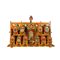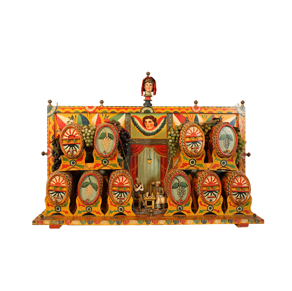MENSOLA DECORATIVA COMPOSTA DA botti e personaggi che giocano a scacchi , in legno dipinto in policromia maestranze siciliane XX secolo h cm 79 x 119 x 29