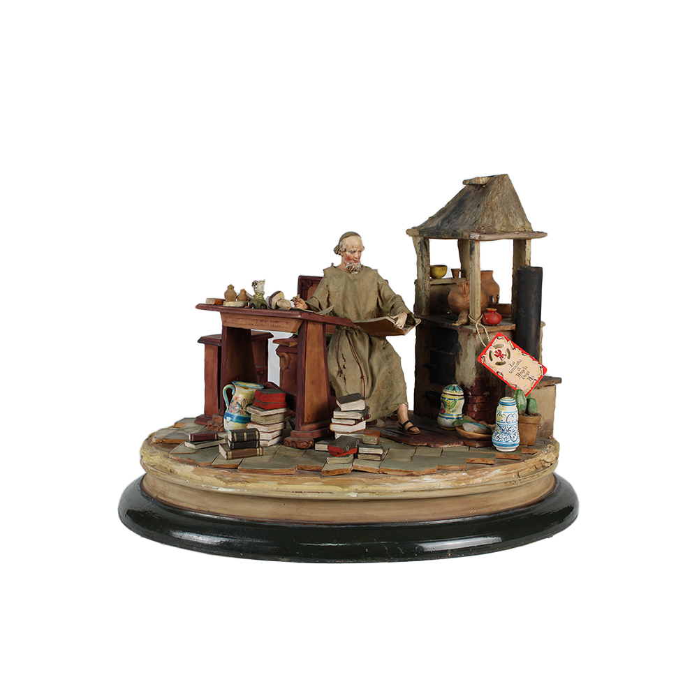 GRUPPO in terracotta policroma raffigurante scena d'interno con frate manifattura La Terracotta di Angela Tripi Sicilia XX secolo h cm 34 x 45 x 35