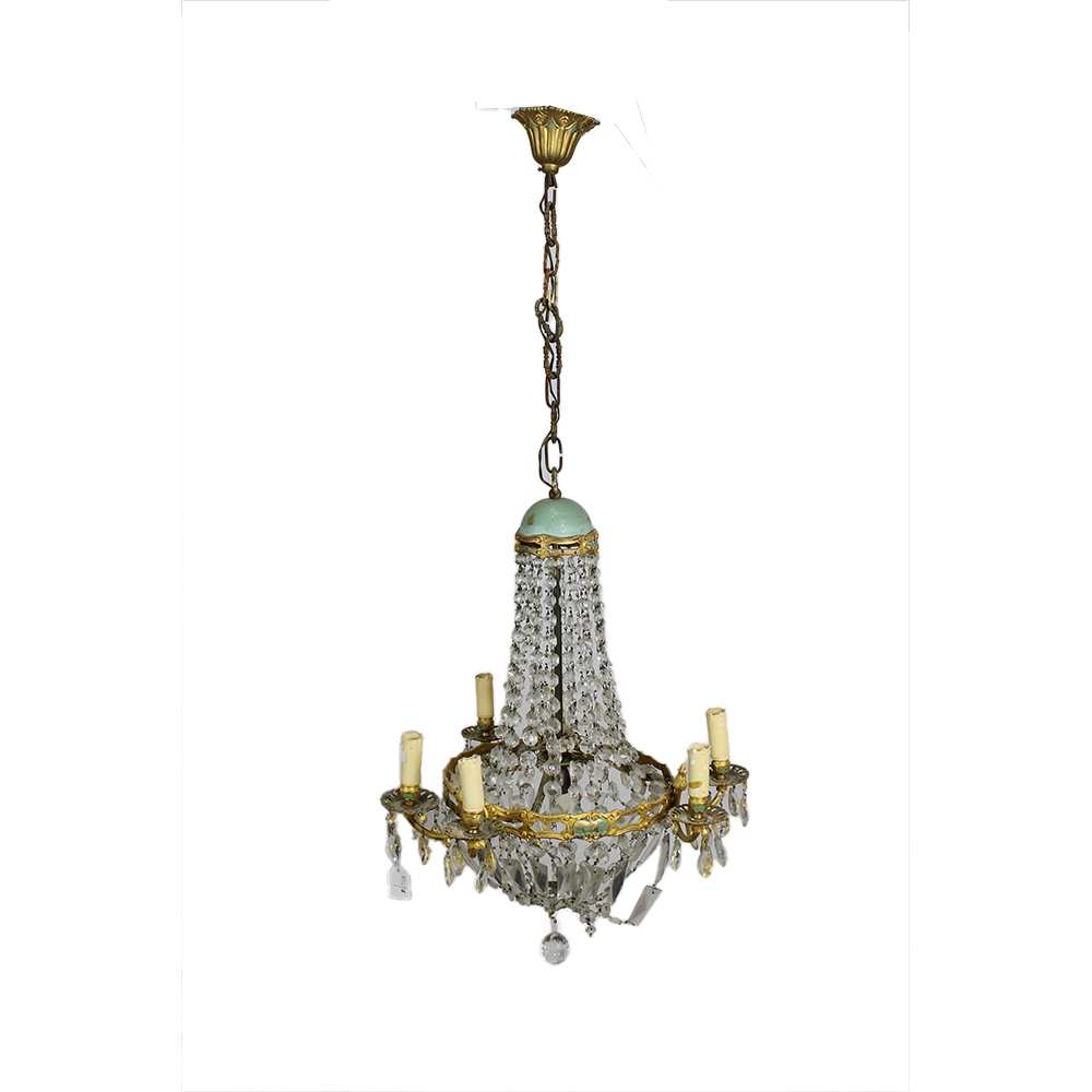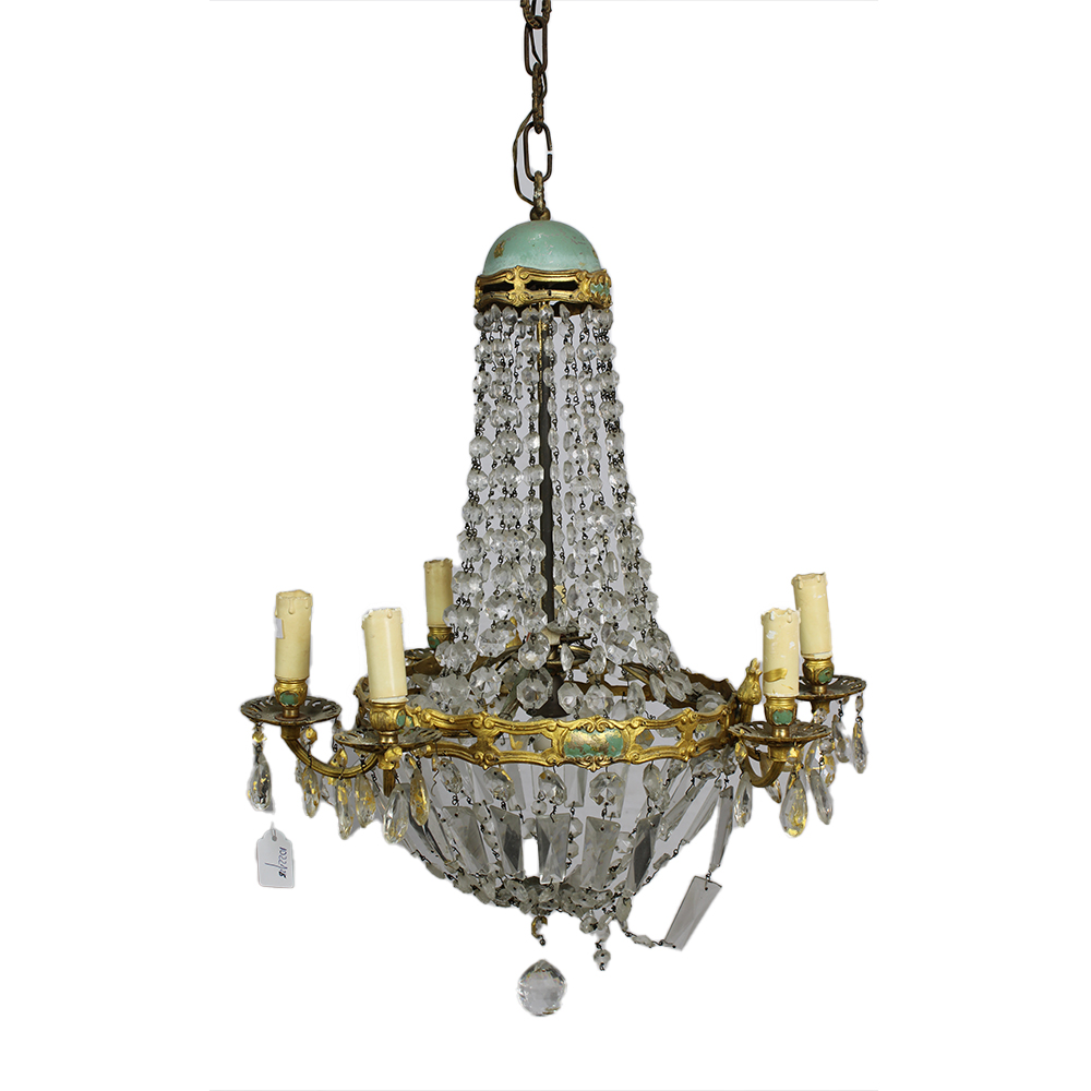 PICCOLA LAMPADARIO A NINFA A 6 LUCI in fusione di bronzo cesellato e brindoli in vetro Francia XIX/XX secolo h cm 113 x 54 x 54
