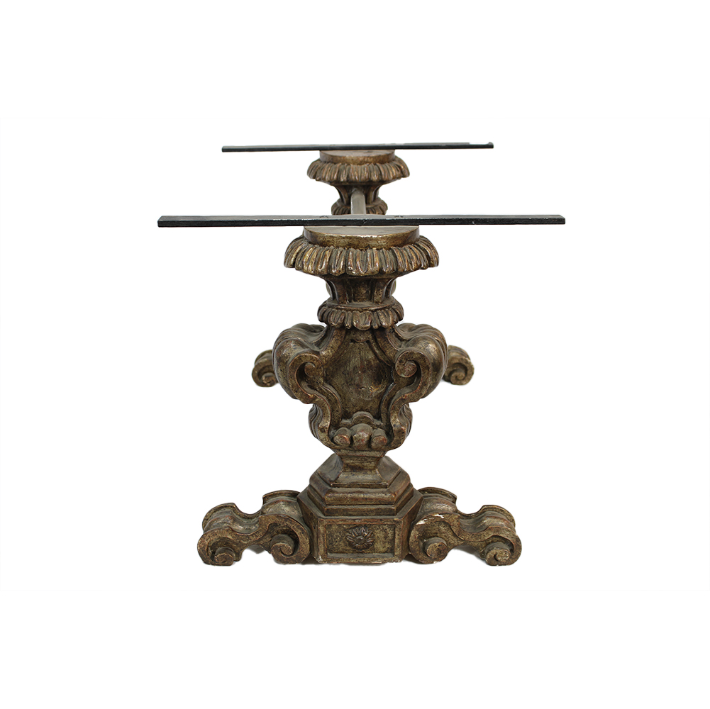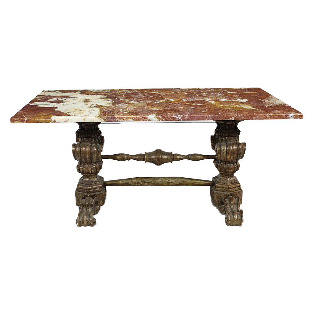 TAVOLINO DA SALOTTO composto da coppia di elementi in legno tornito e dorato raccordati da assi torniti, piano in marmo XX secolo h cm 53 x 130 x 60