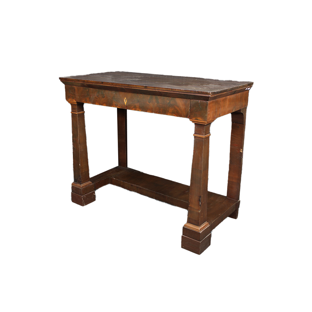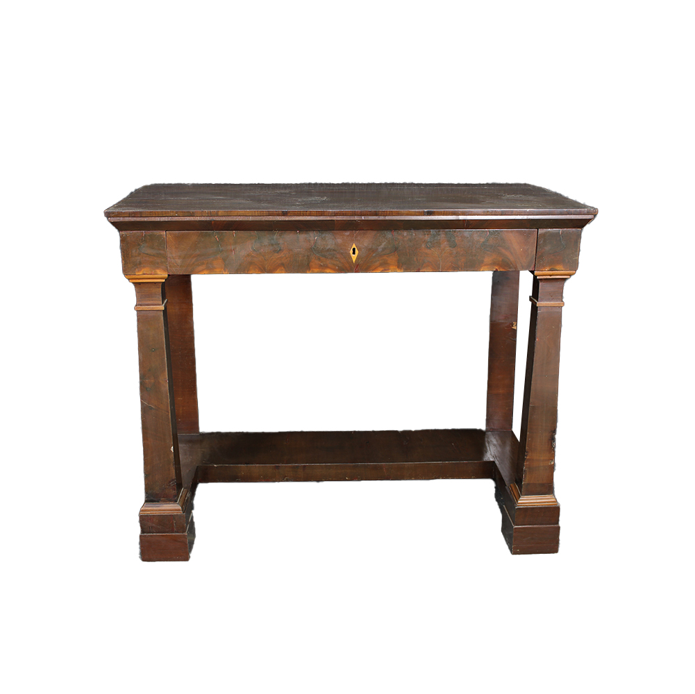 CONSOLLE CARLO X in piuma di mogano con gambe a colonna piano in marmo bianco di Carrara Sicilia XIX secolo h cm 106 x 130 x 63