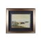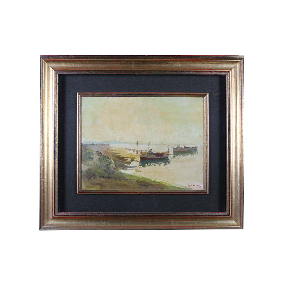 OLIO SU COMPENSATO raffigurante marina con barche e pescatori a firma Rocondi dentro cornice in legno dorato XX secolo h cm 30 x 40 - cornice h cm 56 x 66