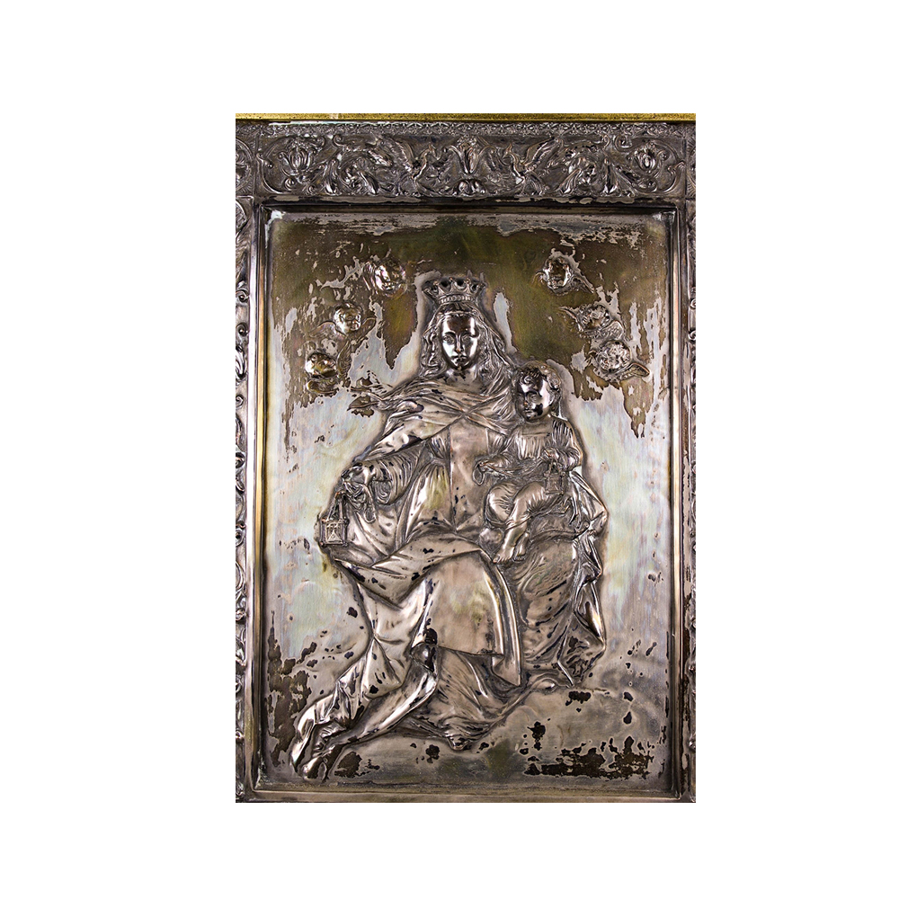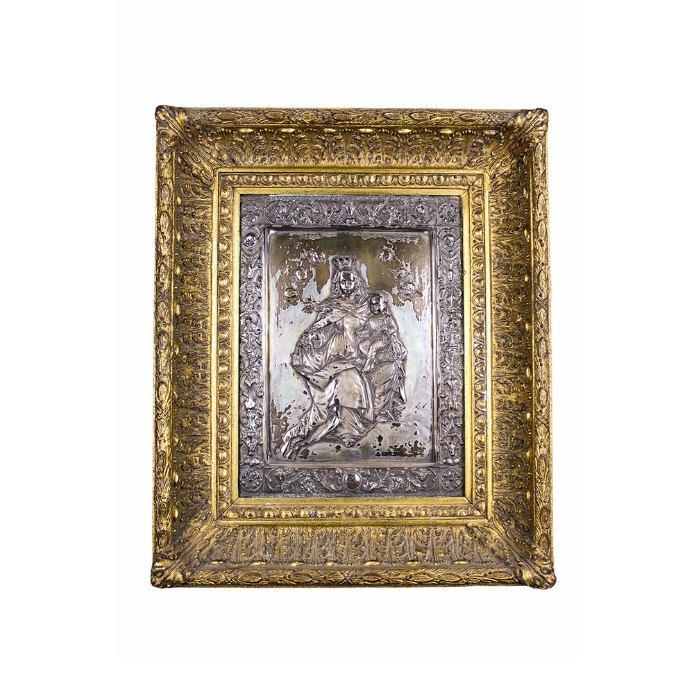 BELLA PLACCA in metallo sbalzato finemente cesellato e argentato raffigurante la madonna e il bambino attorniato da angeli dentro cornice in legno intagliato e pastiglia dorata maestranze siciliane XIX secolo h cm 39 x 29 / cornice h cm 60 x 50