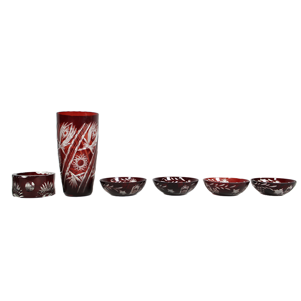 LOTTO COMPOSTO DA 1 vaso, 1 posacenere e 4 ciotole in cristallo Rosa intagliato manifattura Boemia primi 900 misure varie