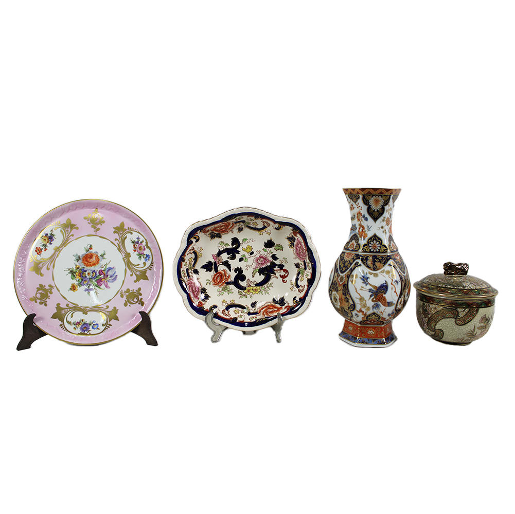 LOTTO DI 4 OGGETTI in porcellana dipinta , lumeggiature in oro, diverse manifatture XX secolo misure varie