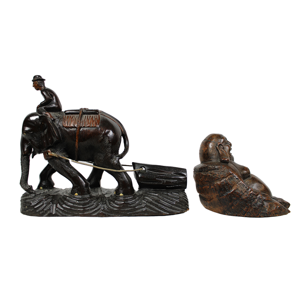 2 SCULTURE in legno raffiguranti una Budda ed una elefante manifattura orientale h cm 18 x 16 x 21 - h cm 29 x 37 x 12