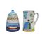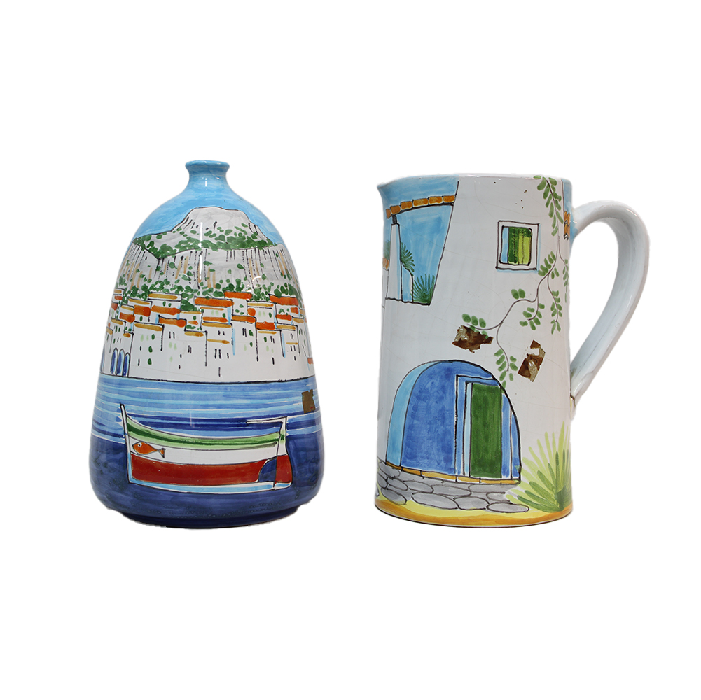 LOTTO COMPOSTO DA 1 caraffa, 1 bottiglia in maiolica dipinta in policromia a firma Chez Nino Cefalù Sicilia XX secolo h cm 20 x Ø 13 - h cm 20 x Ø 15