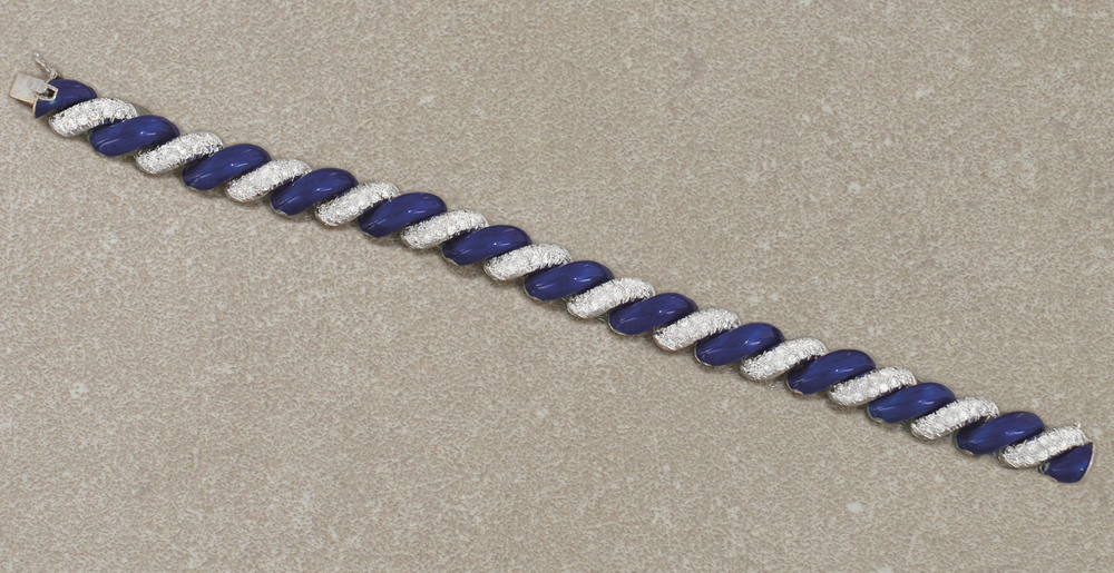 BRACCIALE. In oro bianco 18 kt a maglie incernierate disposte in obliquo con settori in smalto blu alternati a diamanti taglio brillante per tot. cts. 3,20 ca.
