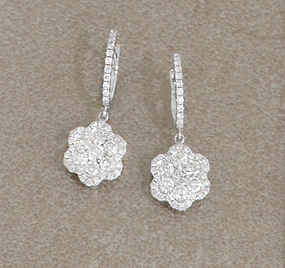 COPPIA DI ORECCHINI. In oro bianco 18 kt a fiore, perno e clip con diamanti taglio brillante per tot. cts. 2,00 ca.