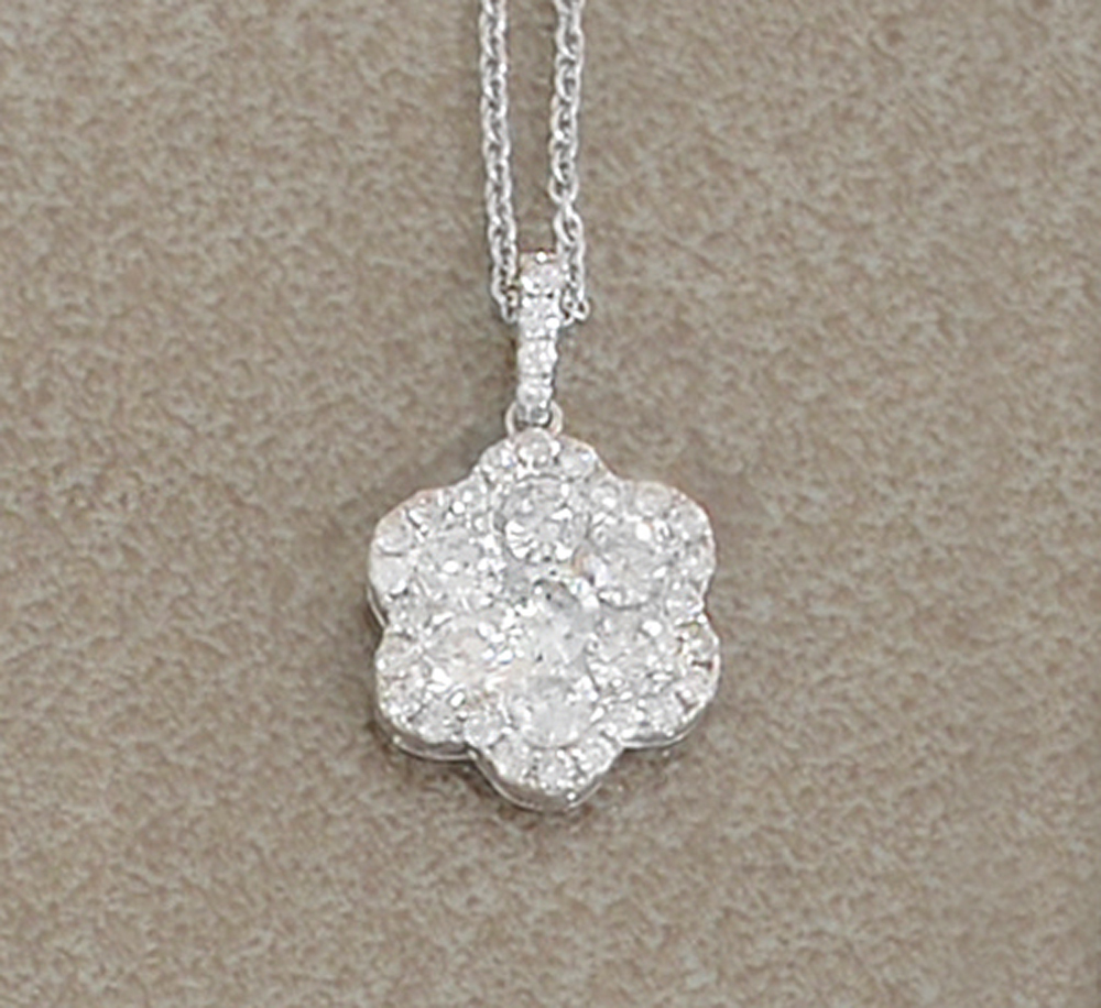 CIONDOLO. In oro bianco 18 kt a fiore con diamanti taglio brillante per tot. cts. 1,50 ca. trattenuto da fine catenina in oro bianco.