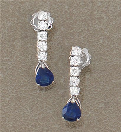 COPPIA DI ORECCHINI PENDENTI. In oro bianco 18 kt perno e farfalla con diamanti taglio brillante disposti in verticale per tot. cts. 1,00 ca. e zaffiri taglio goccia per tot. cts. 3,30 ca. nella parte terminale.