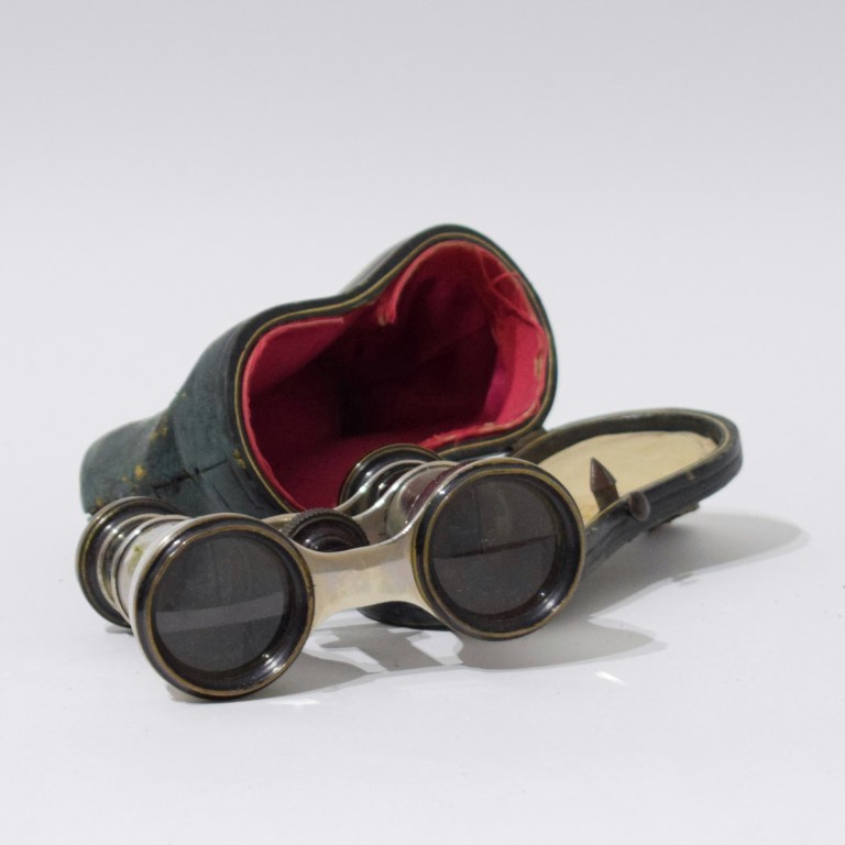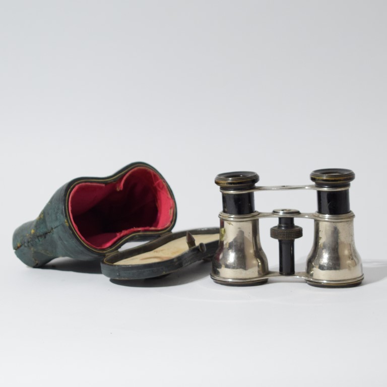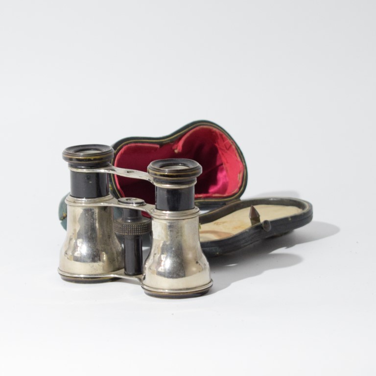 Chromed brass binoculars with their original soft leather case by Callagan of London in New Bond Street.