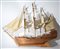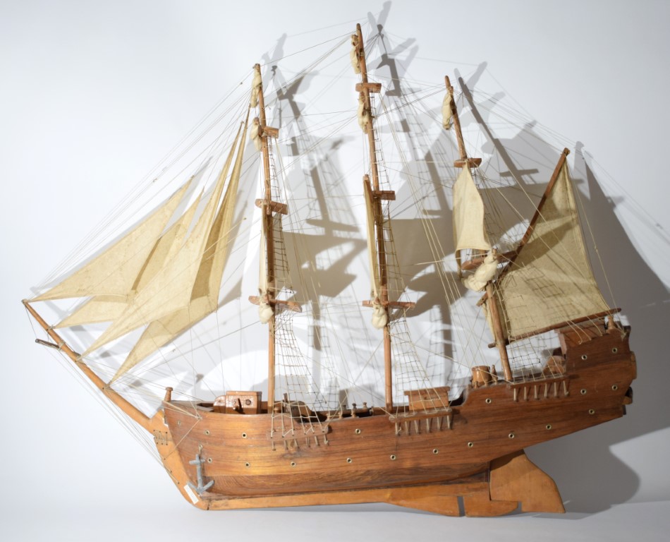 Handmade wooden ship model featuring three masts, rope rigging, and waxed cotton canvas sails. The structure and sail arrangement recall European vessels from the colonial era, possibly inspired by a 17th-century galleon.