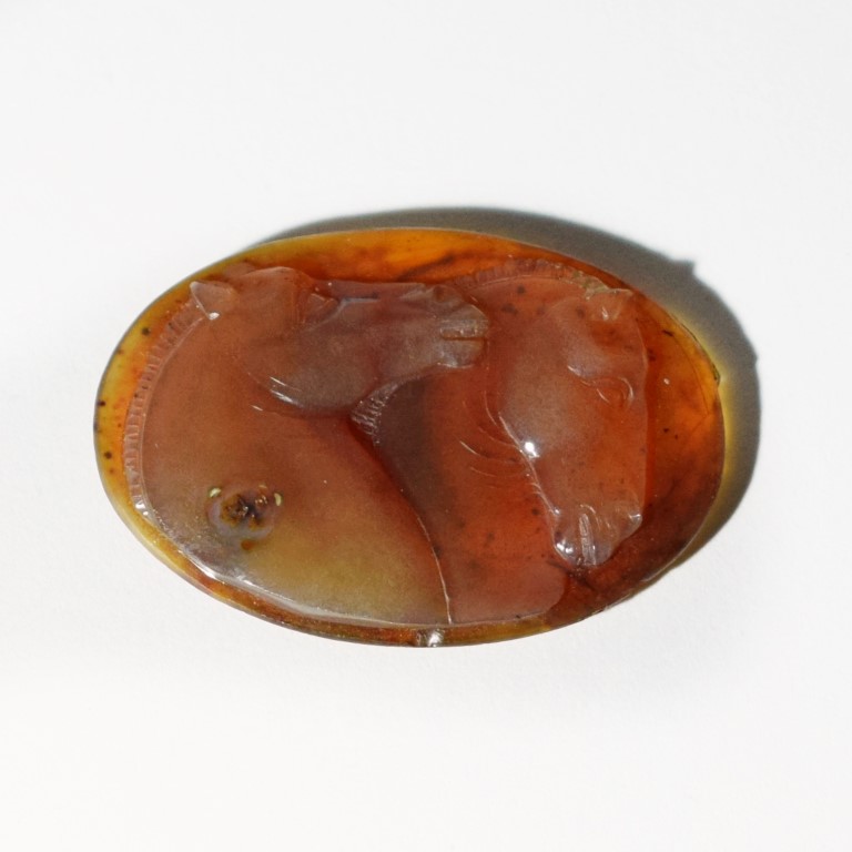 A fine low-relief cameo depicting two horses heads in the style of the Phidias Parthenon frieze.