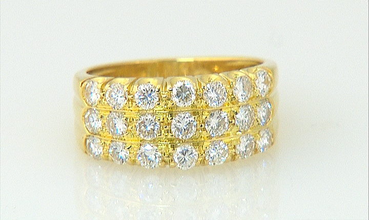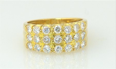 ANELLO. In oro giallo 18 kt a fascia con tre file orizzontali in diamanti taglio brillante per tot. cts. 1,00 ca.