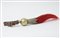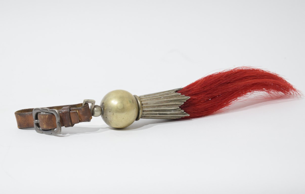 Composed of a thick tuft of bright red dyed animal hair, mounted on shaped metal with leather fittings.