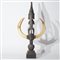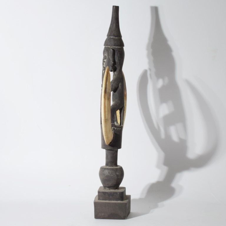Wood sculpture with human figure adorned with two wild boar defenses.