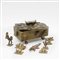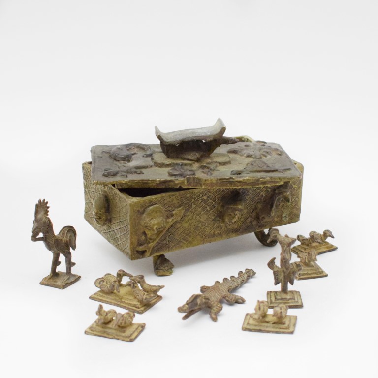 Lot comprising a square copper alloy box and cover for Akan gold weights (Abrammuo) and eight bronze weights.