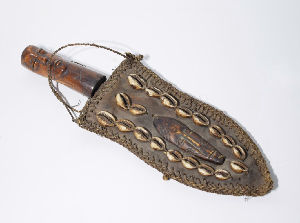 Hardened leather, raffia, shells and bone. Interesting object of use characterized by the showy anthropomorphic handle and the scabbard adorned with a passport mask framed by small cowrie shells.