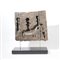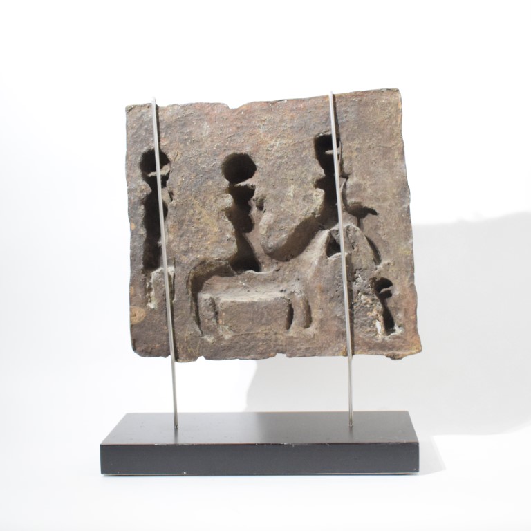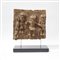 Dark-patinated bronze plaque featuring three high-relief figures, likely depicting the royal procession of an Oba on horseback accompanied by his attendants.
