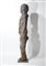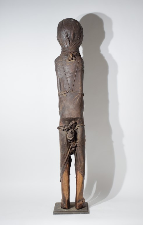 Carved wood, canvas, raffia and other organic materials. The slender figure of a standing woman entirely wrapped in canvas and imprisoned in a thick web of ropes that block her neck and sex. This type of artifacts, called Nkisi, are believed to contain spiritual power or spirits. Minkondi are a subclass of minkisi, with their magic power they are considered aggressive and their primary use is mainly to hunt criminal and enemies, locating and punishing them.