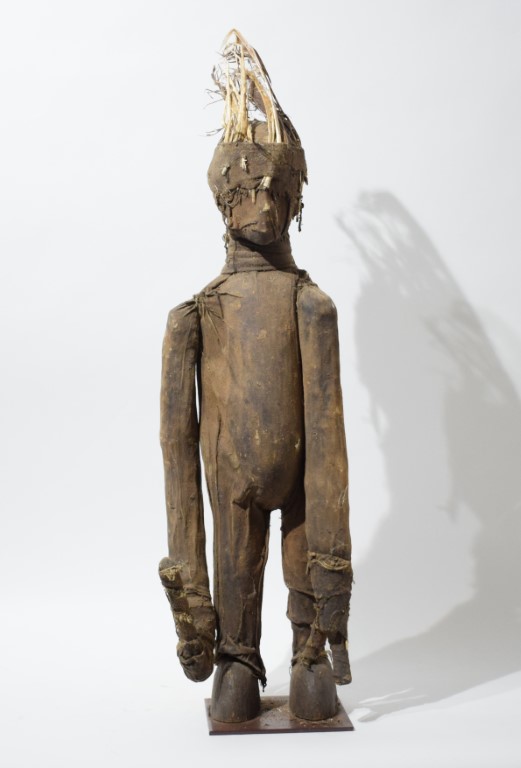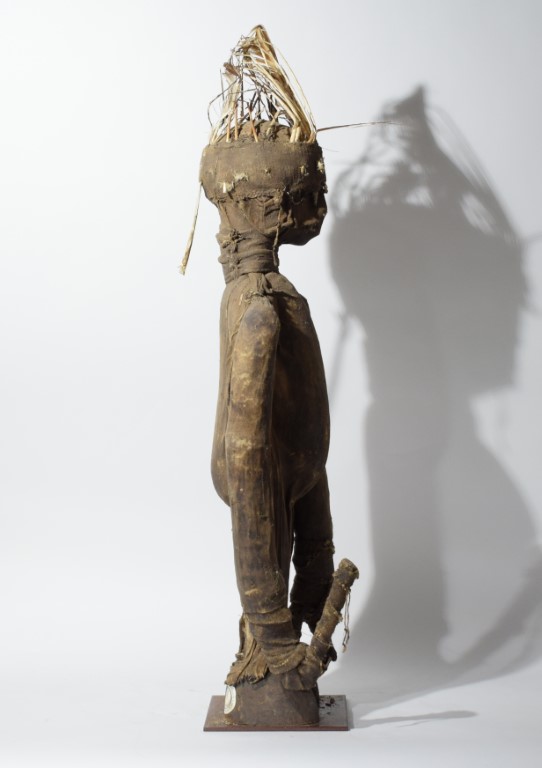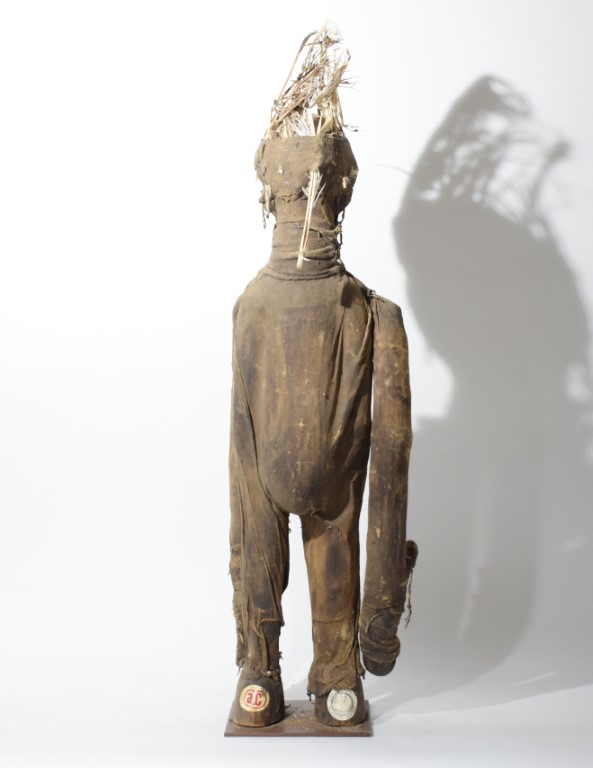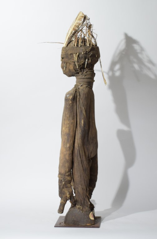 Canvas, wood, feathers and other organic materials. This type of fetich sculpture, known as oracle figures, are striking for their disturbing and enigmatic appearance that transmit a strong sense of oppression and entrapment. Kept shrouded in secrecy, their use is restricted to the most enlightened senior male of the community that use them during trials to identify the guilty or to verify the reliability of depositions.