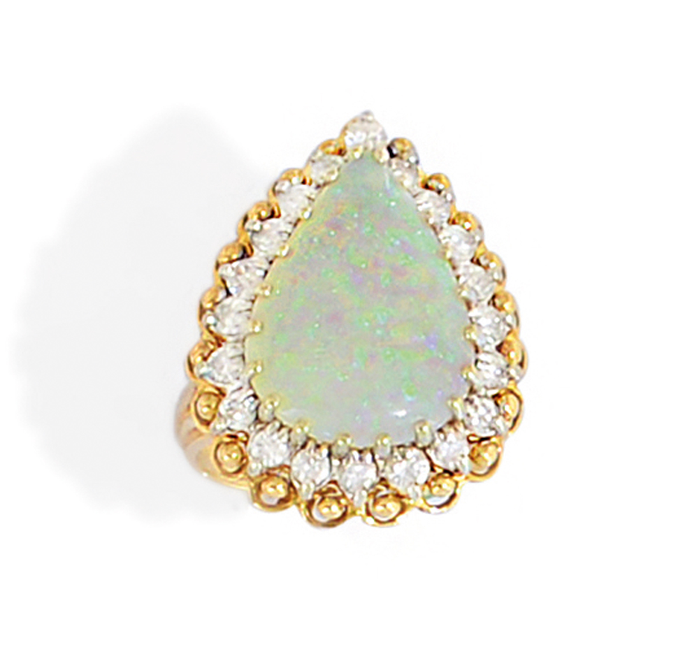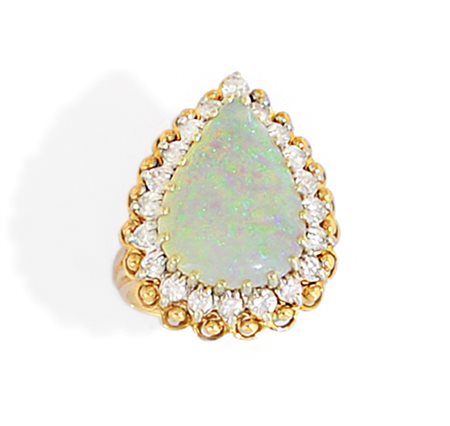ANELLO. In oro giallo e bianco 18 kt centrato da opale taglio goccia cabochon entro cornice in diamanti taglio brillante per tot. cts. 1,00 ca.