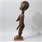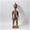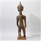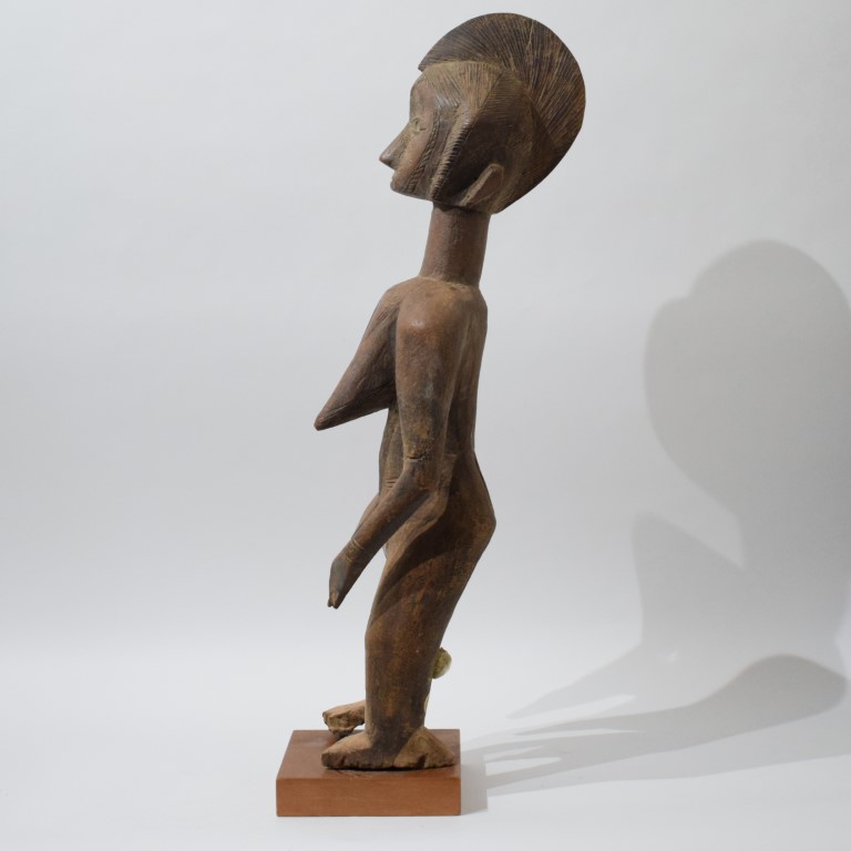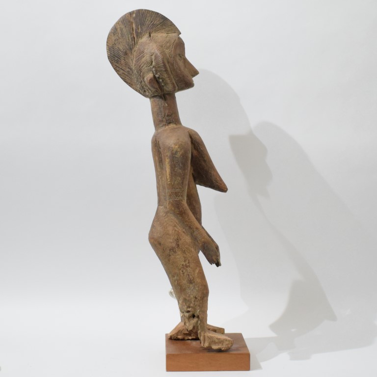 Carved and incised wood. Large standing figure of a young woman with highly stylized face and prominent breast. This sculpture is probably part of a large Karan Wemba mask, artifacts in which the mask are always surmounted by a standing figure like this. This type of masks is used among the Mossi during the funerals of revered women.