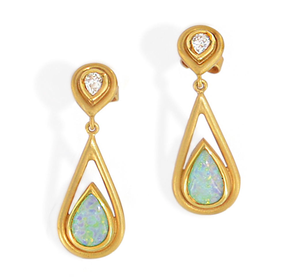 COPPIA DI ORECCHINI PENDENTI. In oro giallo 18 kt perno e farfalla a doppio corpo, satinati con diamanti taglio goccia per tot. cts. 0,40 ca. ed opali Australia taglio goccia cabochon per tot. cts. 2,50 ca.