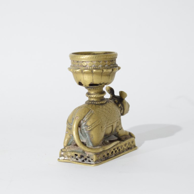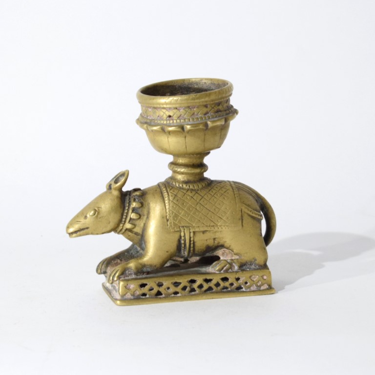Votive bronze oil lamp shaped as a sacred rat, symbol of vigilance, cunning, and subterranean power. The oil reservoir is mounted on the animal's back.