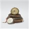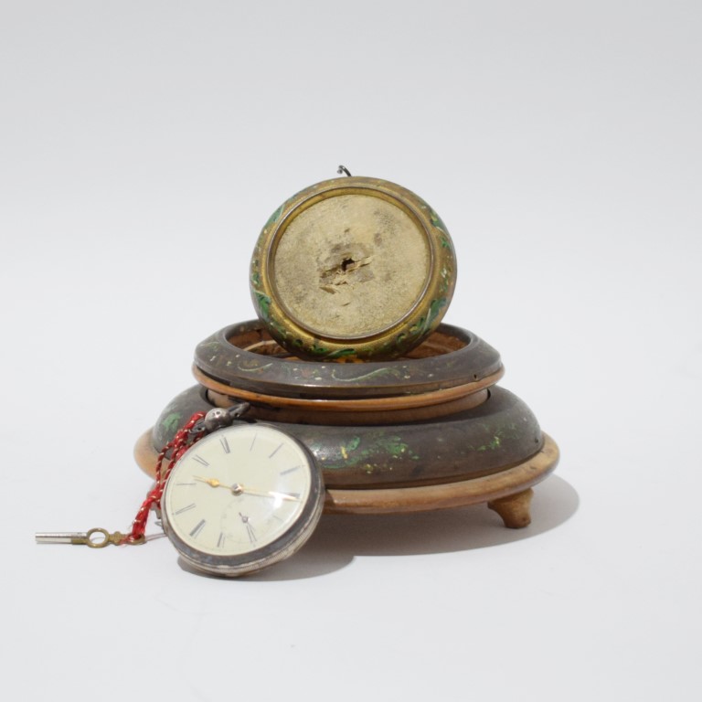 Double-case pocket watch, likely in silver, mounted on a turned wooden stand covered with knurled metal and hand-painted.
