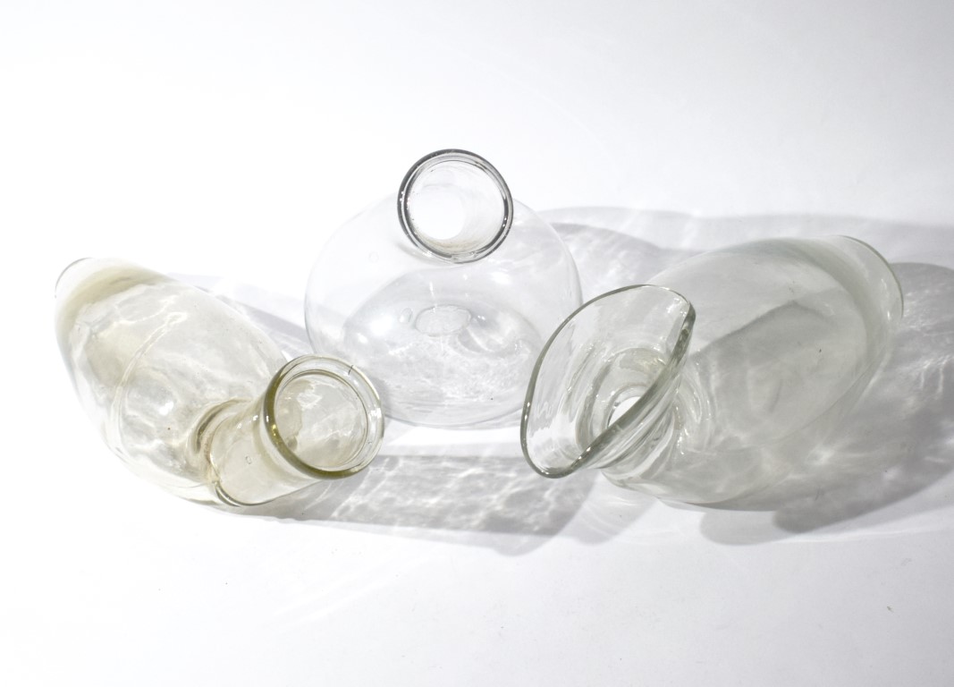 Lot consisting of three glass bottles of different size and shape. Two of these pieces are meant for male use, while the third is for female use.