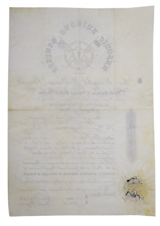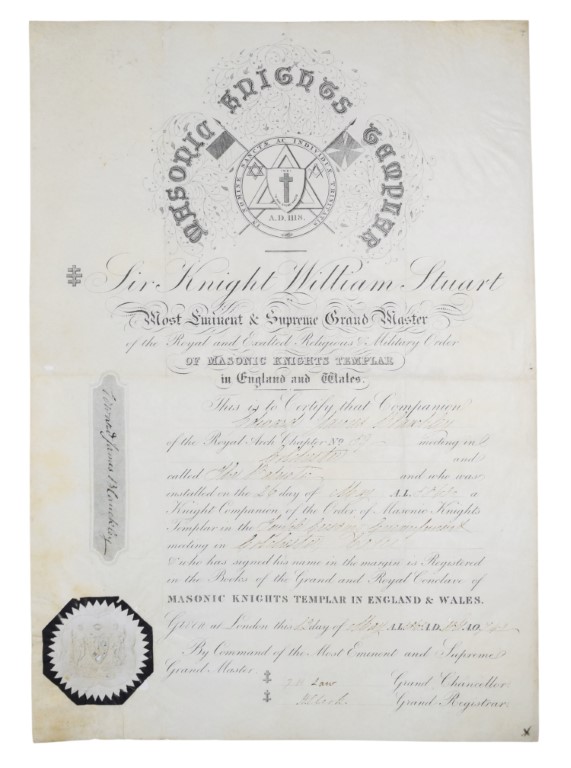 A rare Victorian-era document issued by the Great Conclave of the Masonic Knights Templar of England and Wales, dated May 26, 1863, certifying the initiation of Companion Edward James Blaksley into the esteemed Order of the Masonic Knights Templar. Originating from Royal Arch Chapter No. 89 'Marquis of Lansdowne,' based in Wiltshire, the certificate is partially handwritten in elegant 19th-century script and retains its original embossed seal, depicting two armed Templar knights flanking a heraldic shield.