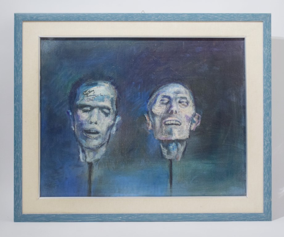 The subject, two heads impaled on stakes, evokes a dramatic image suspended between historical representation and existential allegory. Signed on the back of the canvas.