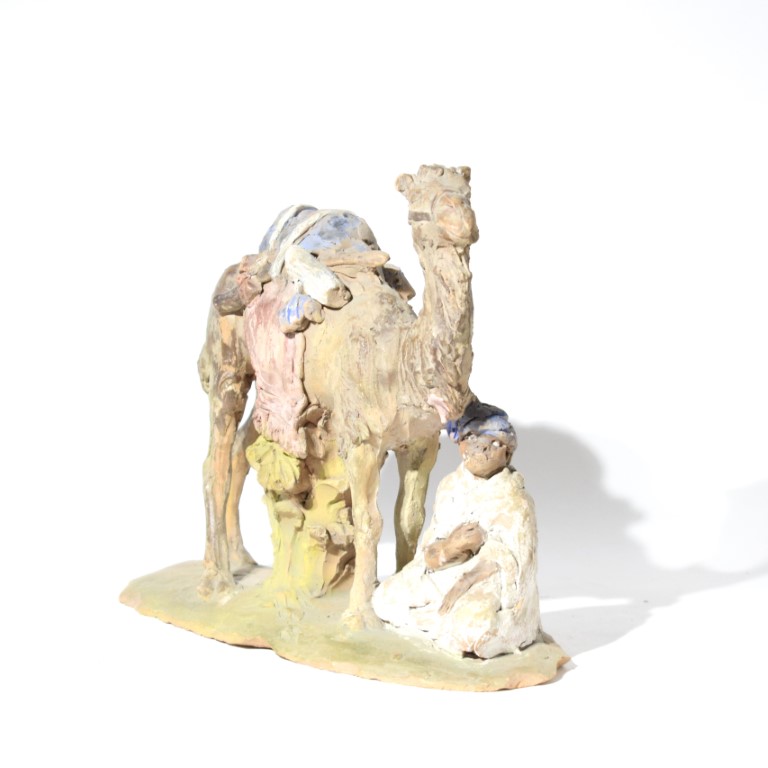 Terracotta sculpture partially polychrome depicting a standing caparisoned camel and a sitting Arab.