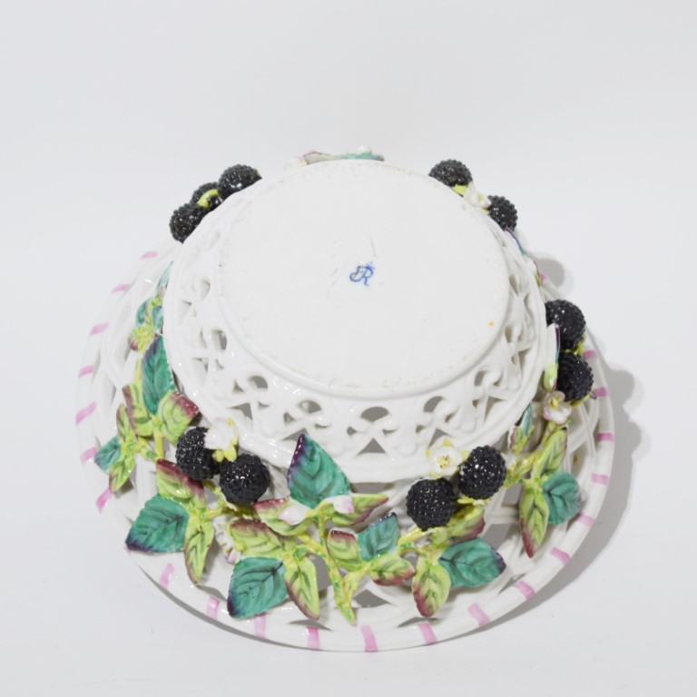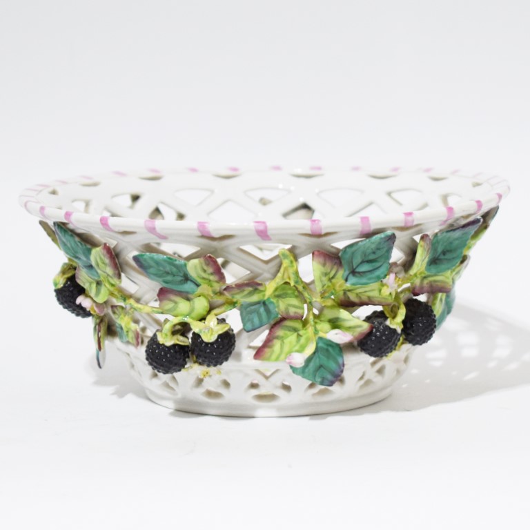 A porcelain casket in bright colours with pierced body decorated with branches of blackberry.