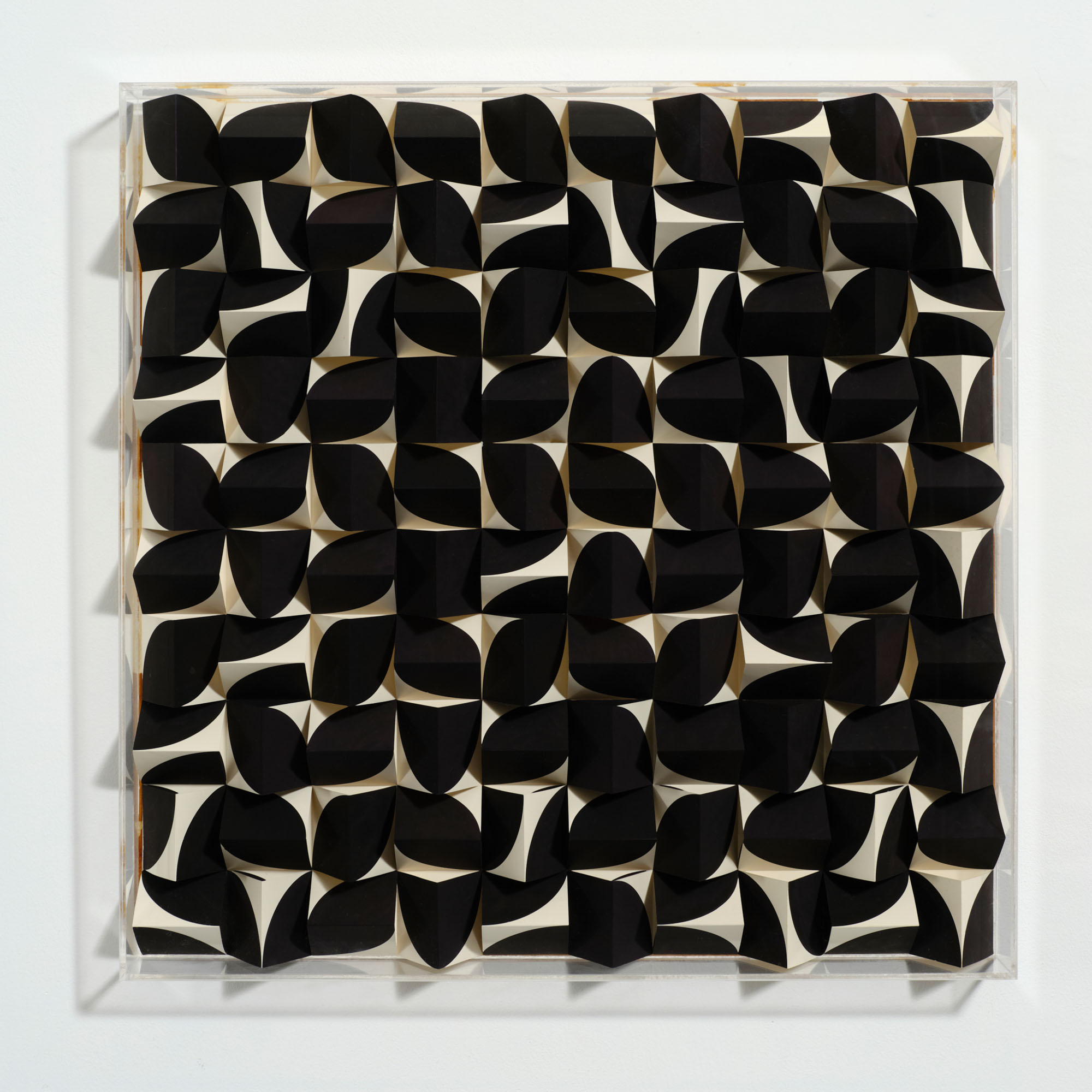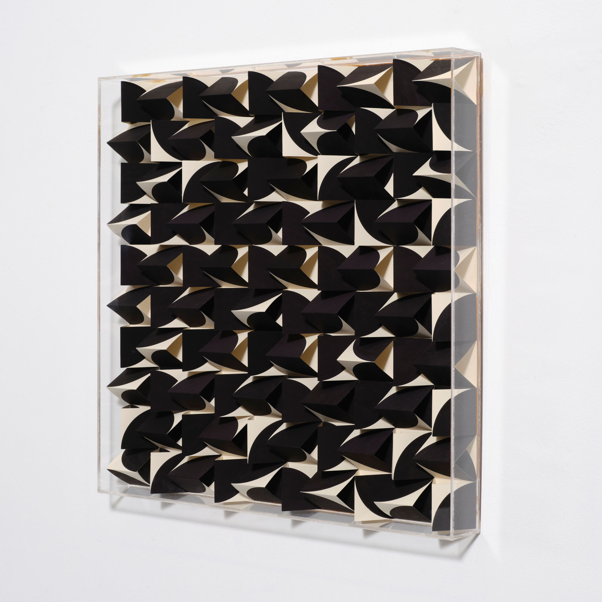 Cartoncini piegati e assemblati entro teca in plexiglas, cm 61 x 61 x 7