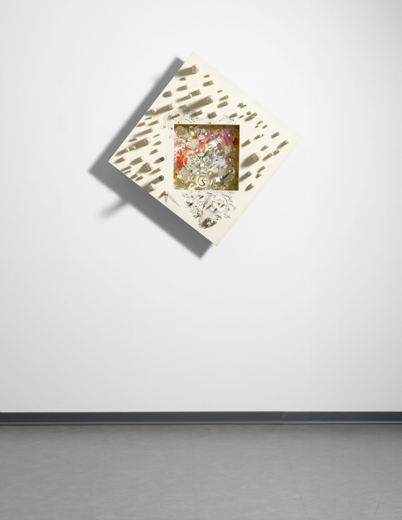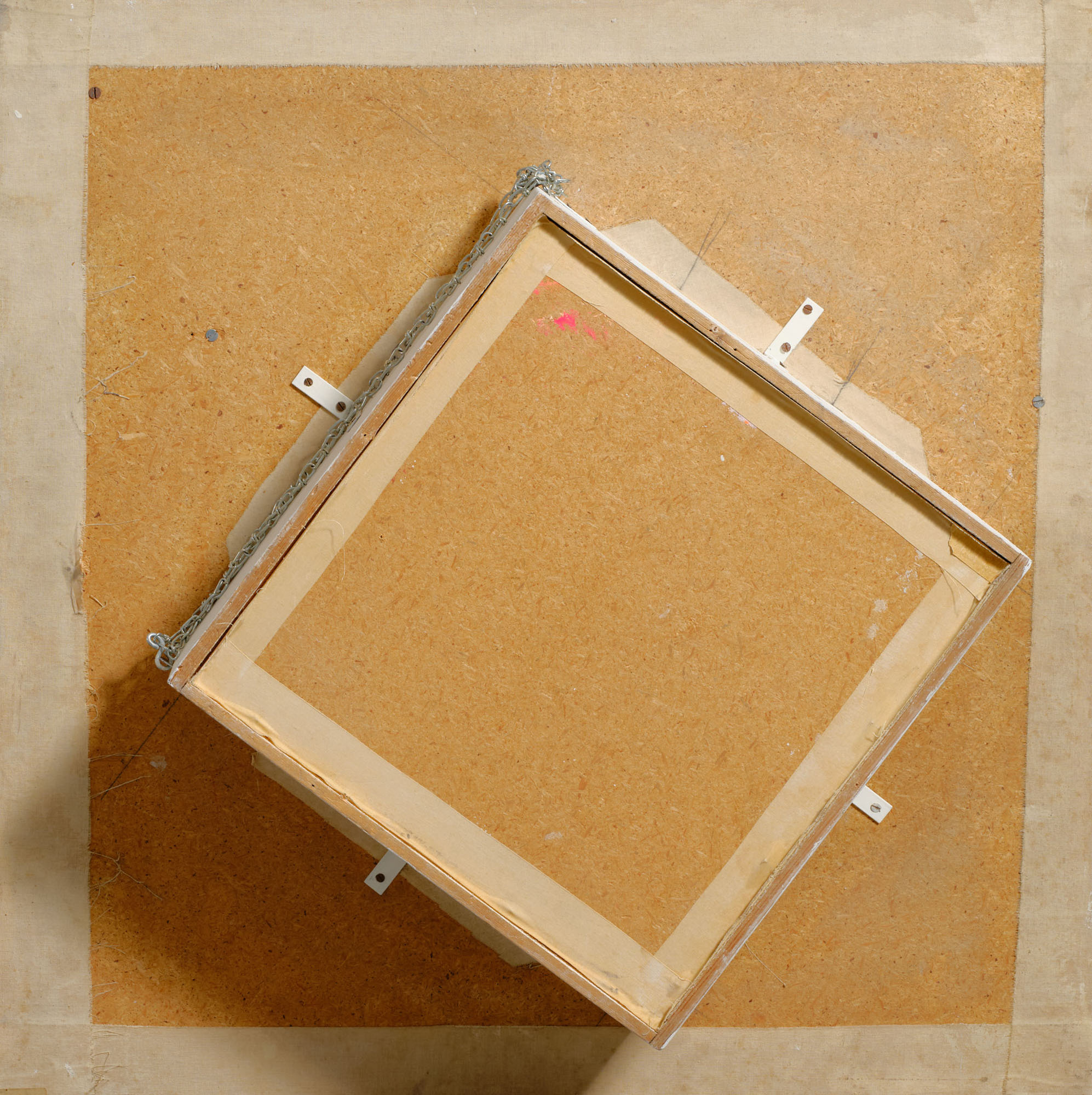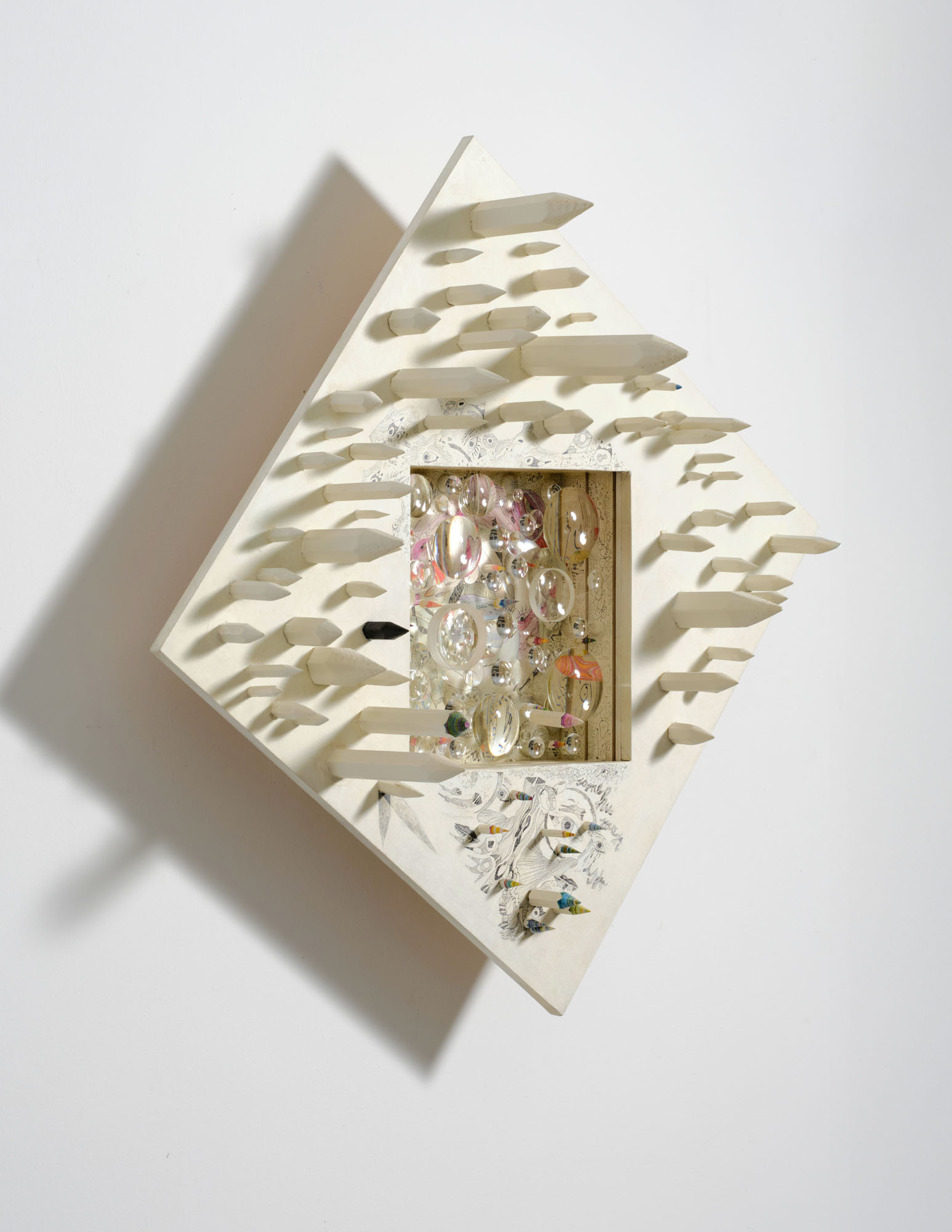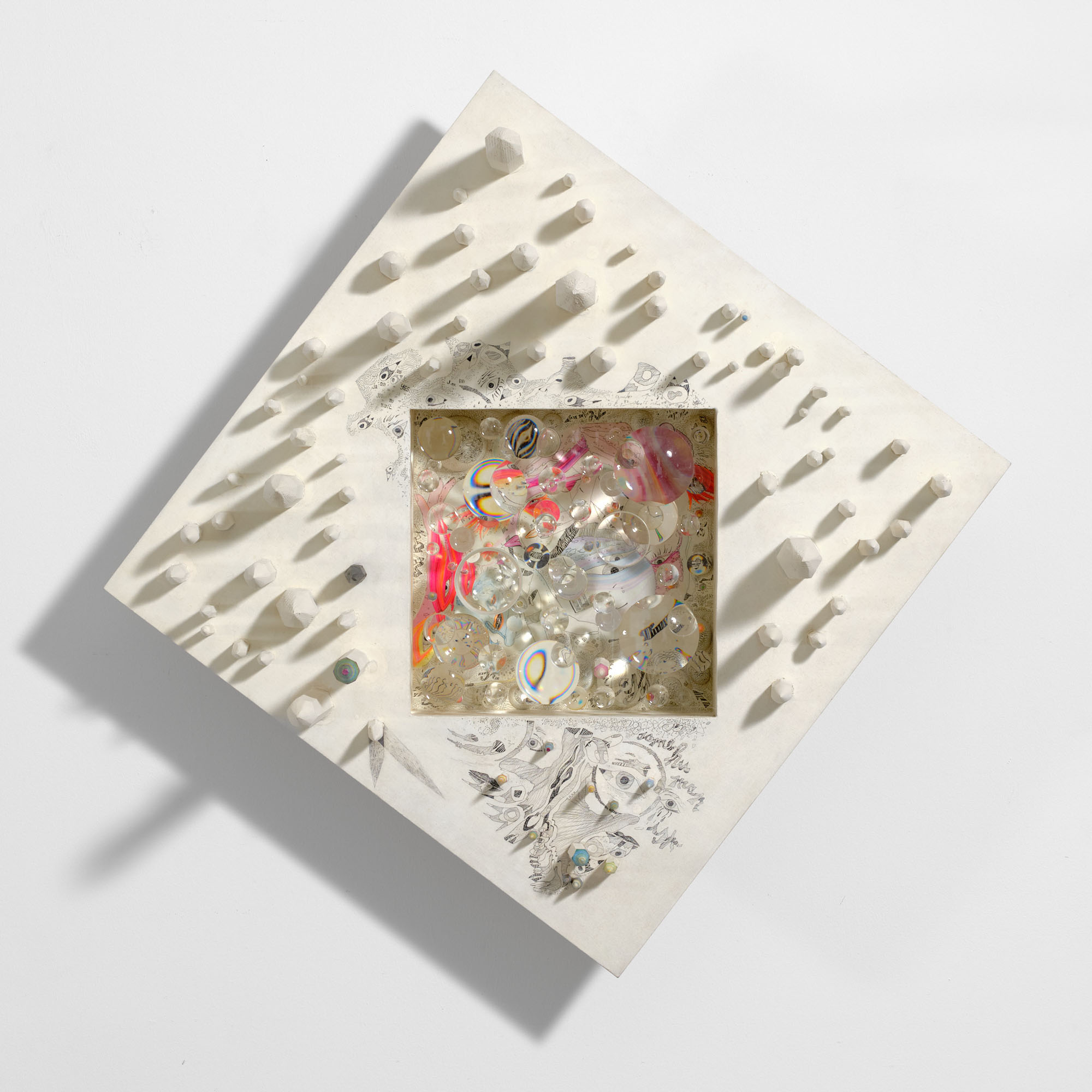 Legno sagomato e dipinto, vetro, lenti ottiche, inchiostro, pittura e matite colorate, cm 112 x 112 x 45 (lato cm 80 x 80)