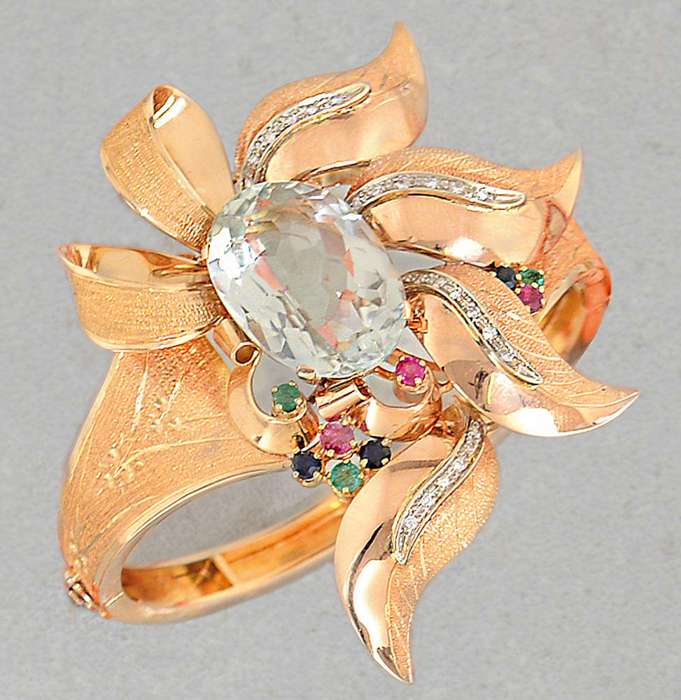 BRACCIALE. In oro giallo e bianco 18 kt montatura rigida con decori lisci ed incisi, parte centrale a grande fiore con ametista verde (prasiolite) taglio ovale di cts. 25,00 ca. entro decori in zaffiri, rubini e smeraldi taglio rotondo per tot. cts. 1,00 ca. e diamanti taglio brillante per tot. cts. 0,20 ca.