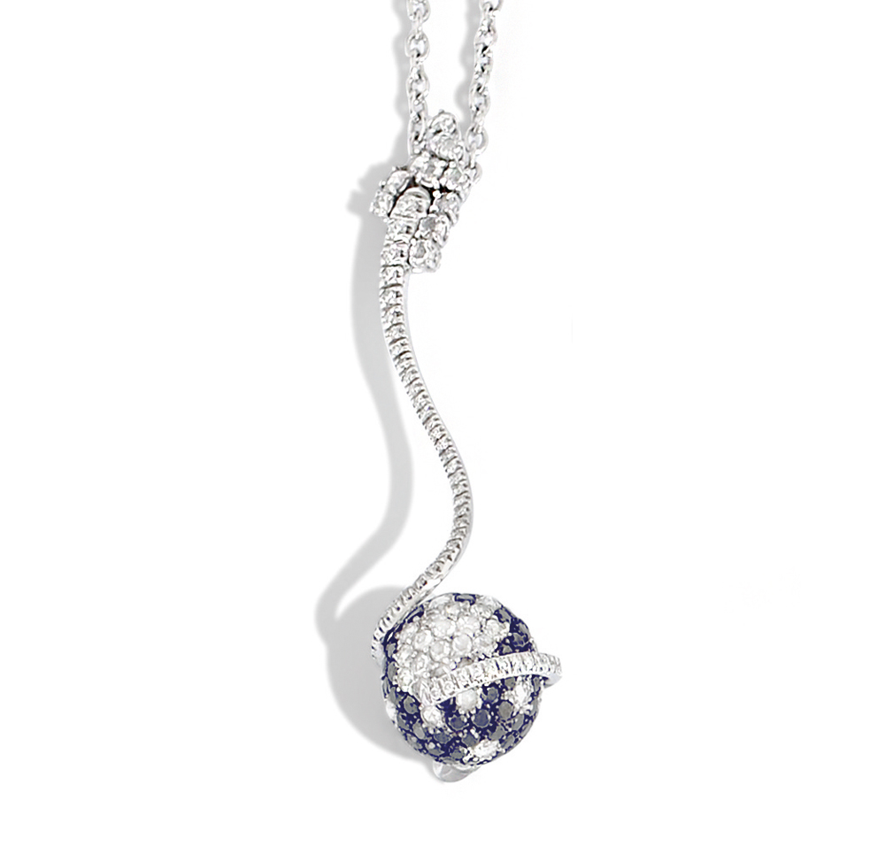 CIONDOLO. In oro bianco 18 kt con settore verticale mosso trattenente inserto a sfera, diamanti taglio brillante e rosa incolore e neri per tot. cts. 4,00 ca., trattenuto da catena ad anelli in oro bianco 18 kt.