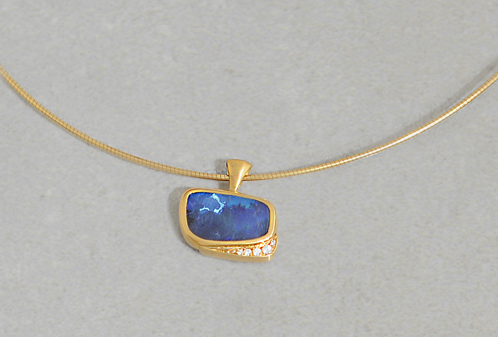COLLANA. In oro giallo 14 kt a maglia a coda di topo con pendente in oro giallo titolo 900 millesimi centrato da opale nero australiano in boulder con decori in diamanti taglio brillante per tot. cts. 0,08 ca.