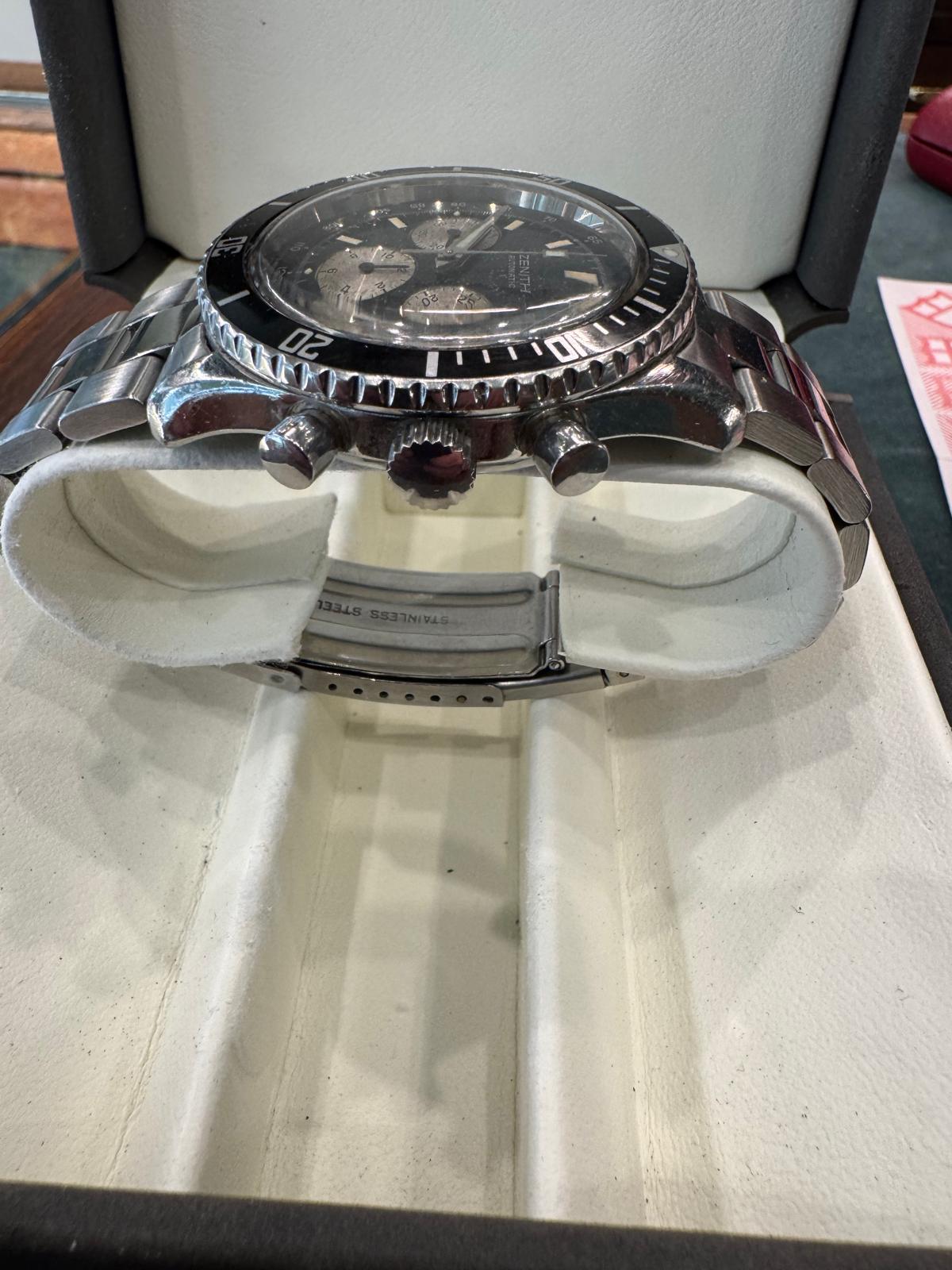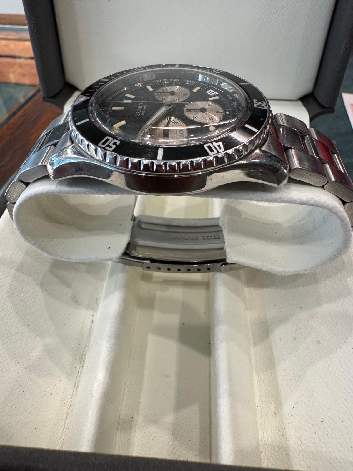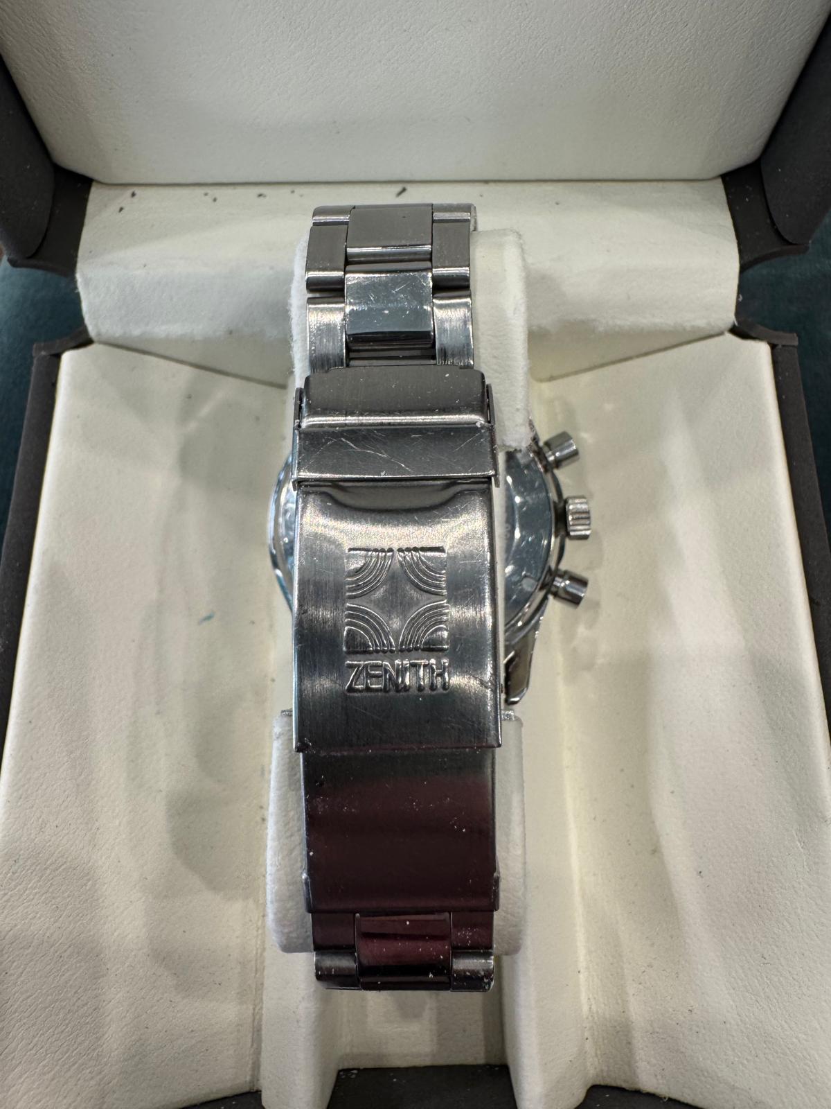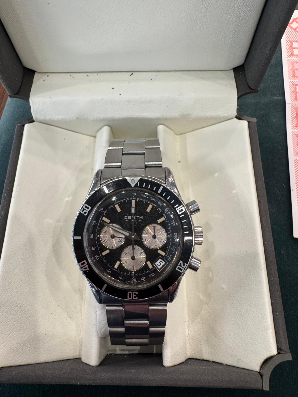 Marca Zenith Modello (Orologio) El Primero Chronograph Numero di referenza 01.0040.400 Carica Automatico Materiale della cassa Acciaio Materiale cinturino acciaio Anno di produzione 1980 (Anno approssimativo) Condizione Usato (Ottimo) L'articolo presenta segni di usura lievi, come ad esempio graffi leggeri, ma non percepibili al tatto. Ultima revisione 21 novembre 2024 Revisione interna Corredo scatola originale , no documenti originali Carica Automatico Materiale della cassa Acciaio Diametro 40 mm Materiale lunetta Acciaio Vetro Plexiglas Quadrante Nero Numeri sul quadrante Senza numeri - COMMISSIONE D’ASTA 25%