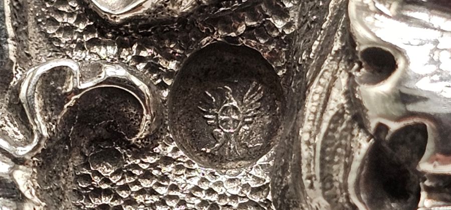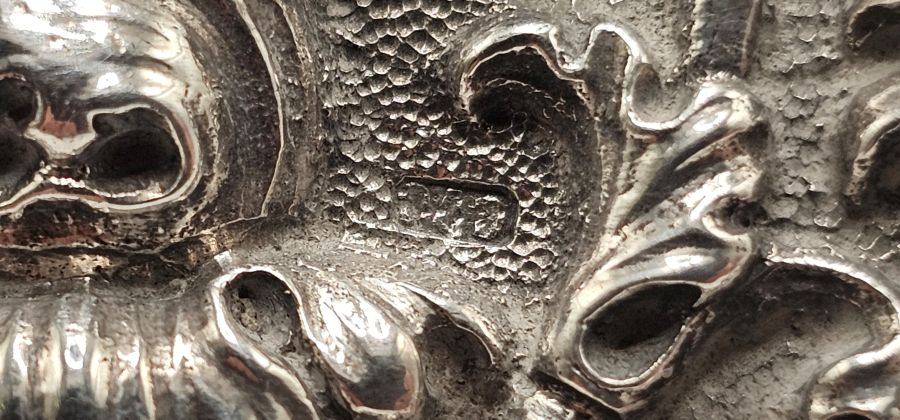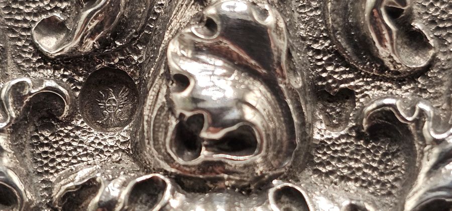Punzonata con il marchio di garanzia utilizzato per i grossi lavori d’argento a 1° titolo (950/1000) in uso a Torino, Regno di Sardegna, dal 1824 al 1861 e con il marchio dell'argentiere Giuseppe Giovara. (cfr. A. Bargoni, Mastri orafi e argentieri in Piemonte dal XVII al XIX secolo, Torino, 1976, tav. XII e p. 15 e segg.).